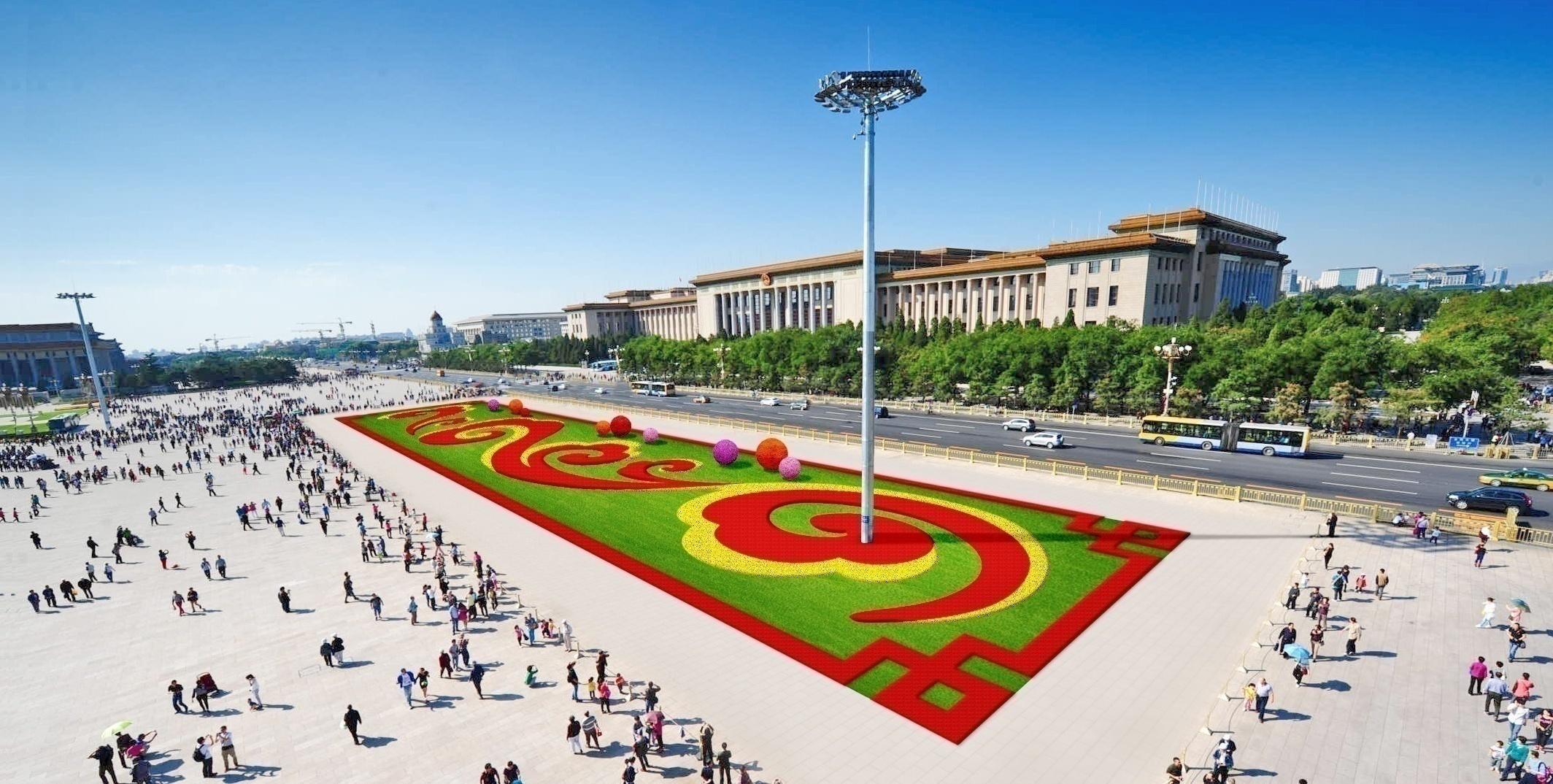 天安门广场两侧绿地延续吉祥如意花带布置方式,花卉布置总面积5050平方米,两侧还将布置花球共18个。