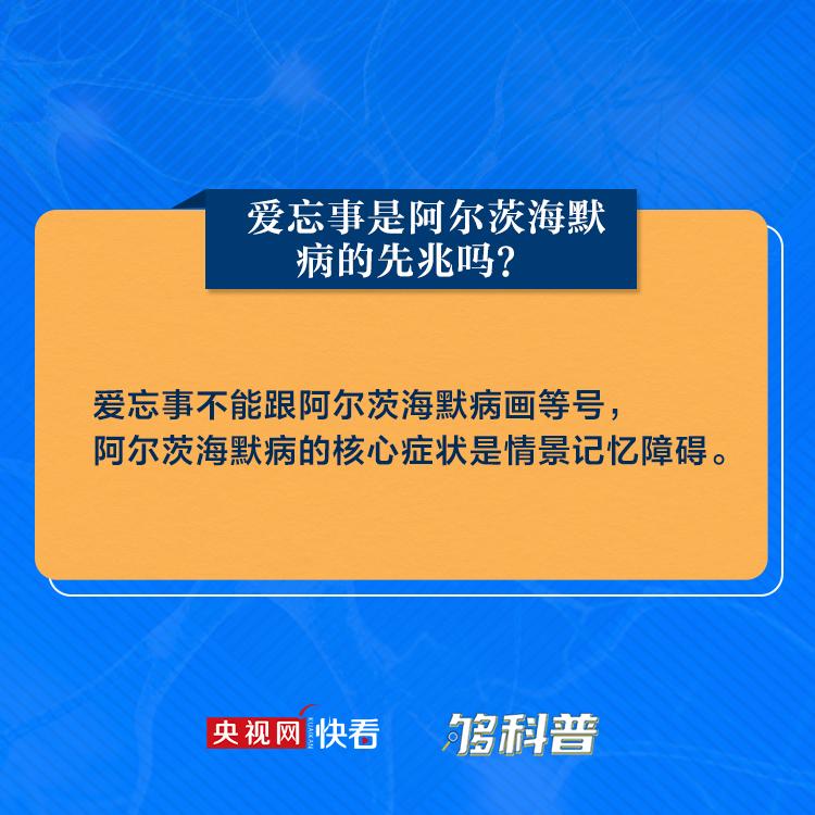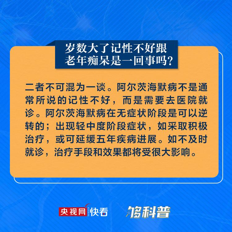 9月21日是世界阿尔茨海默病日。阿尔茨海默病(Alzheimer’s disease,AD)俗称老年性痴呆,是发生于老年和老年前期、以进行性认知功能障碍和行为损害为特征的中枢神经系统退行性病变。岁数大了记性不好跟老年痴呆是一回事吗?爱忘事是阿尔茨海默病的先兆吗?阿尔茨海默病的早期症状又有哪些?九张图带你了解阿尔茨海默病。(记者/杜安琪 设计师/刘京京 校对/闫田田)
