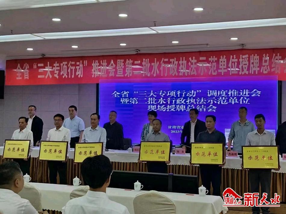 新天水讯【通讯员颉定武 牛强】9月18至19日,甘肃河湖水资源执法保护“三大专项行动”调度推进会暨第二批水行政执法示范单位授牌总结会在平凉召开,甘谷县水务局被省水利厅命名为“全省水利系统第二批行政执法示范单位”称号。