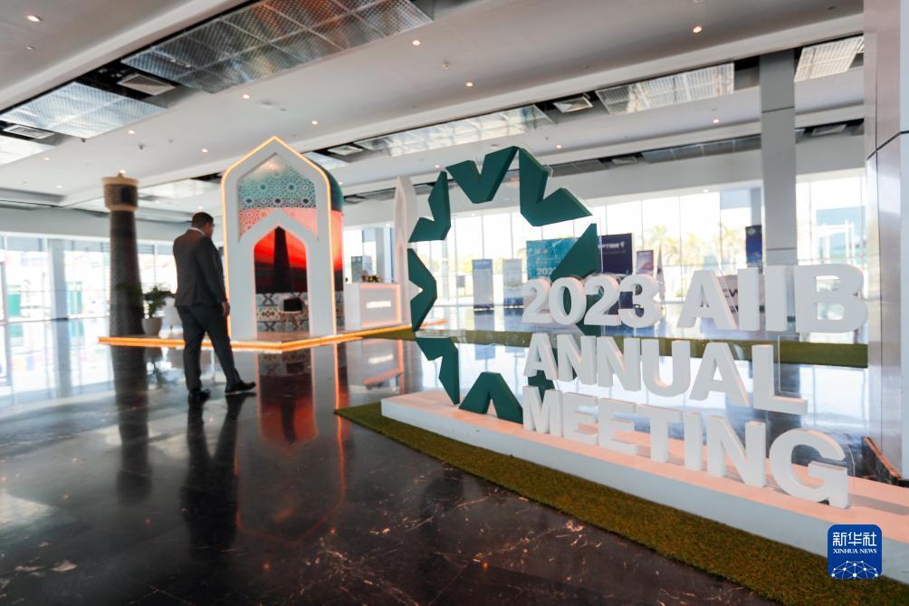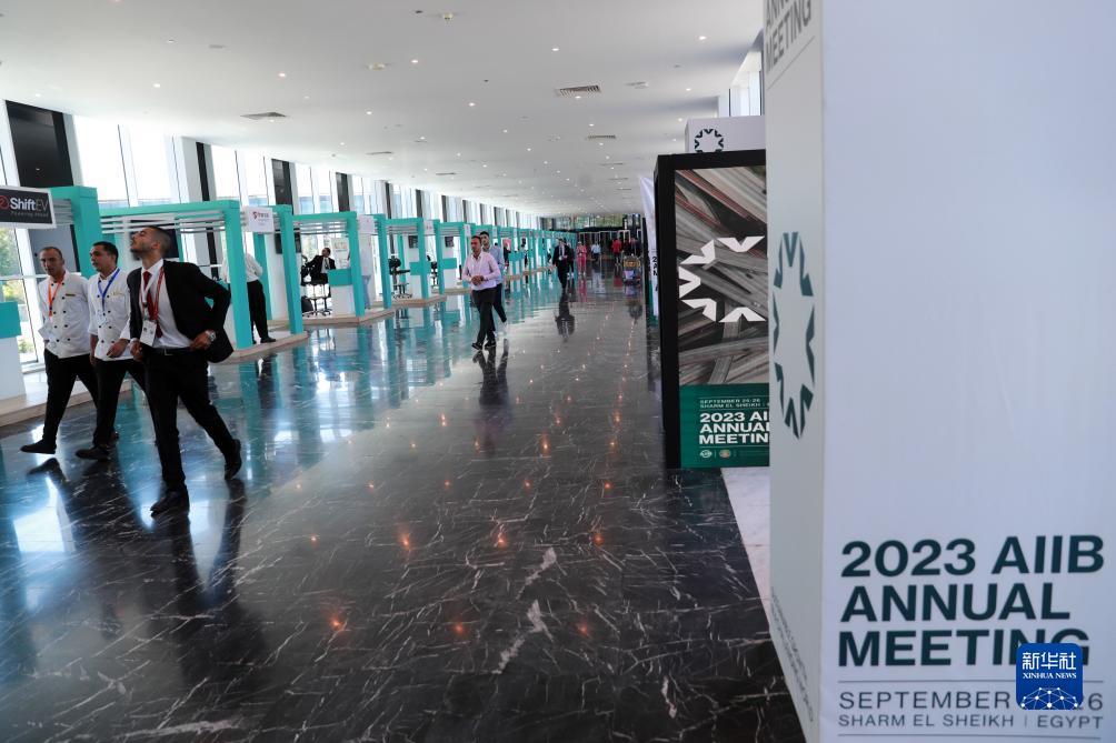 9月26日,在埃及沙姆沙伊赫,参会者走过亚投行第八届理事会年会的展板。新华社记者 隋先凯 摄