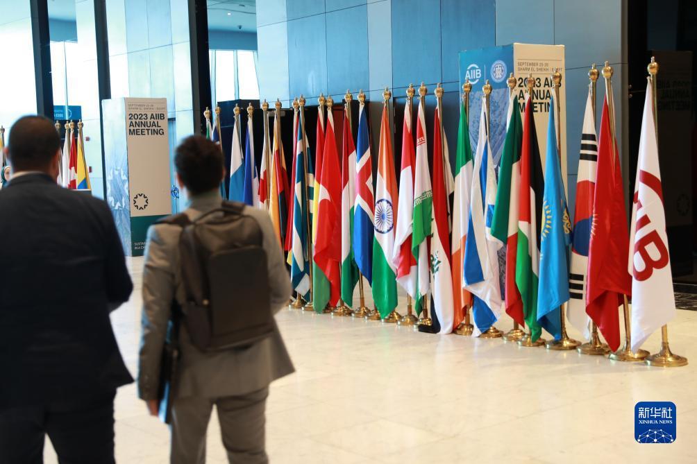 9月26日,在埃及沙姆沙伊赫举行的亚投行第八届理事会年会期间,参会者走过亚投行成员国国旗。新华社记者 隋先凯 摄