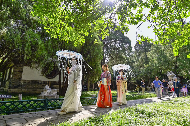 10月5日,游客身着传统服饰行走在山东省青州古城景区。新华社发(王继林摄)