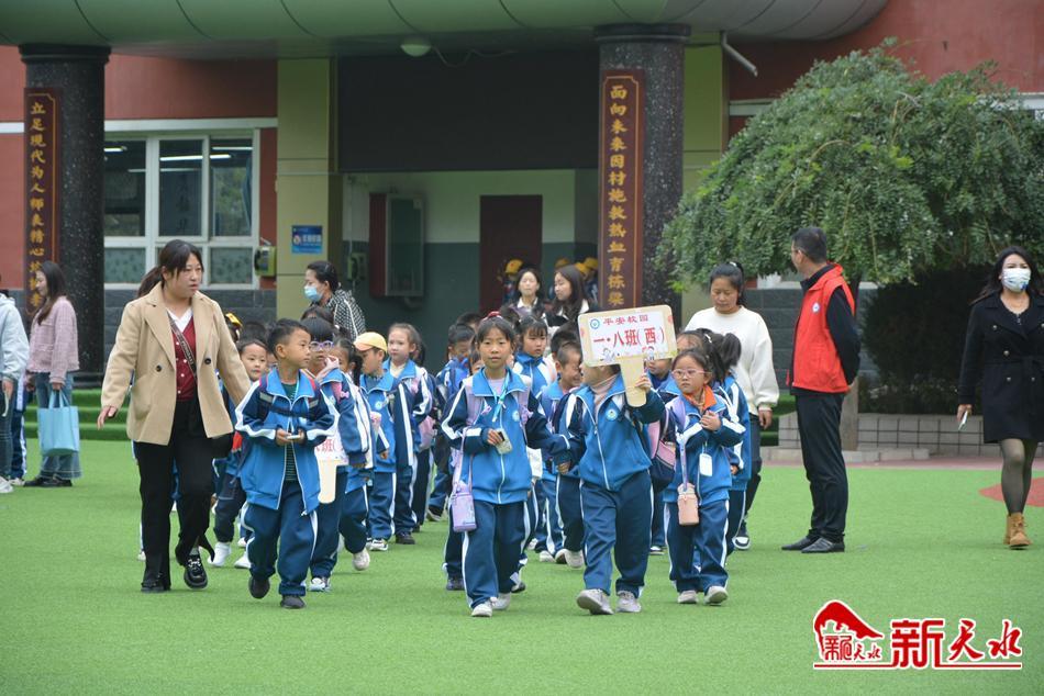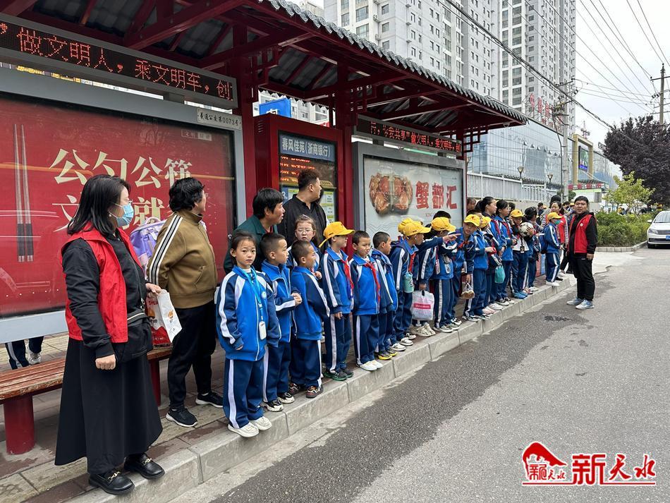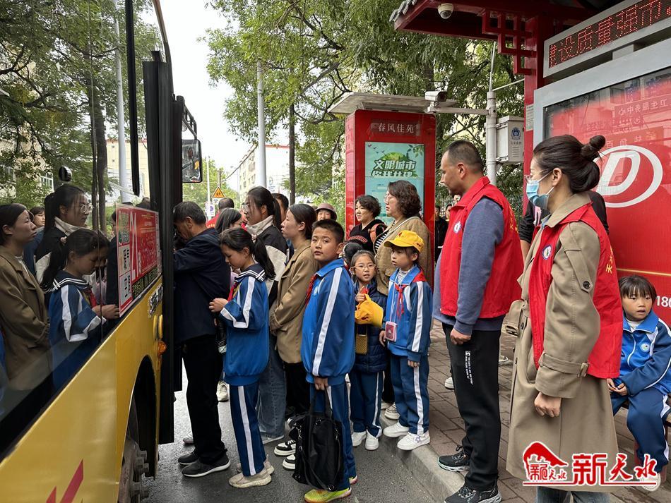 随着一辆23路公交车缓缓驶入,站台上的人流开始向前涌动。教师武志伟立即上前,站在车门旁,有序地指挥着学生和家长们排队乘车。“中午11:30到12:10学生错峰放学期间,我们都会轮流在距离学校较近的两个公交车站开展‘护学岗’。”武志伟告诉记者,现在学校每天按照班级轮流开展“护学岗”,所有教师都会参与,负责维护学生们的上下学秩序,并在车站组织学生们安全乘车。