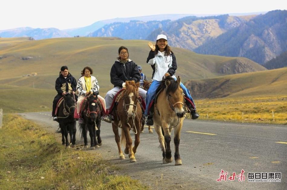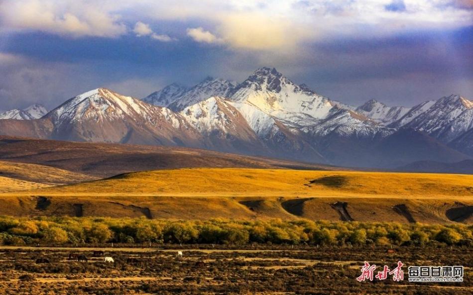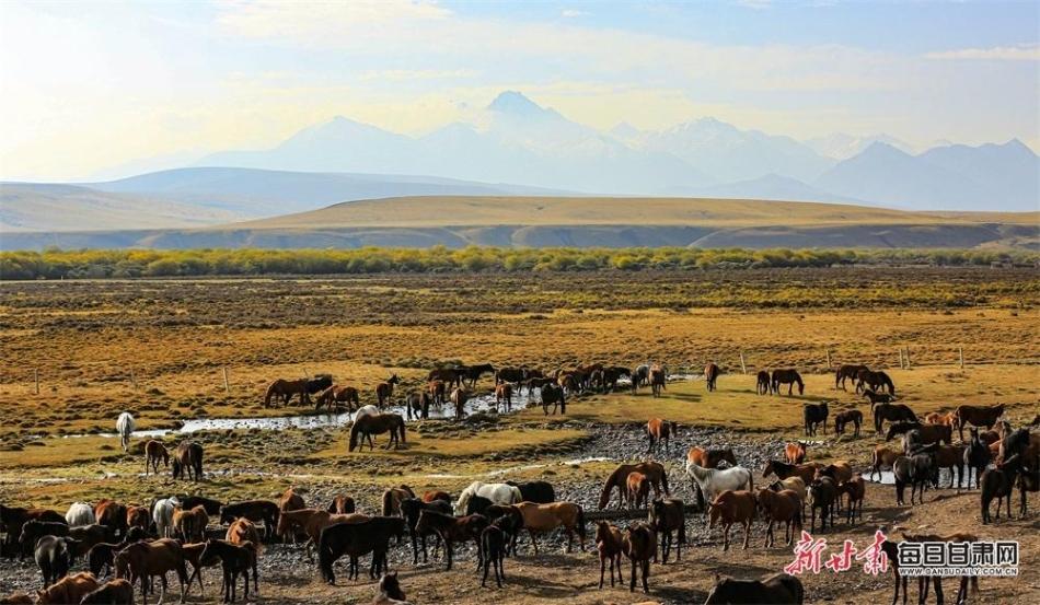 秋日的山丹马场草原,虽然少了春夏的繁花似锦,但更显静谧安详。远处连绵的草原广阔无垠,深深浅浅的黄色在草地上绵延起伏,直到与天边的雪峰相接。