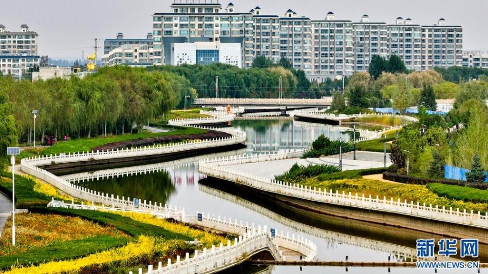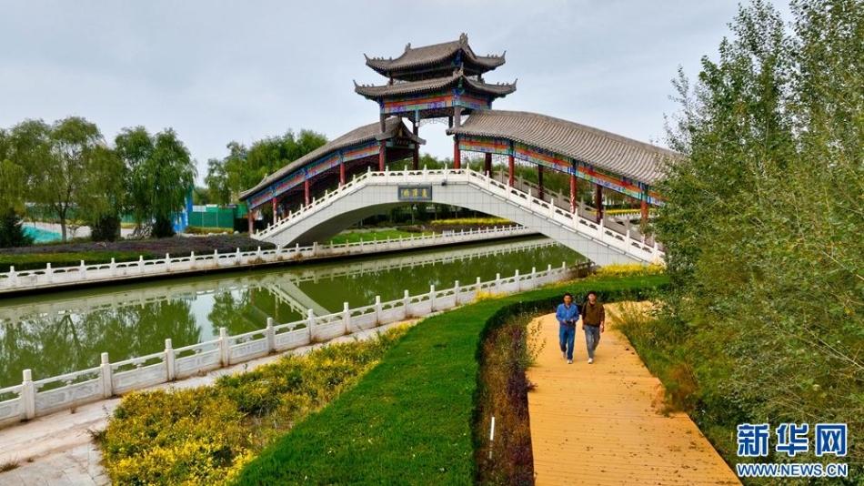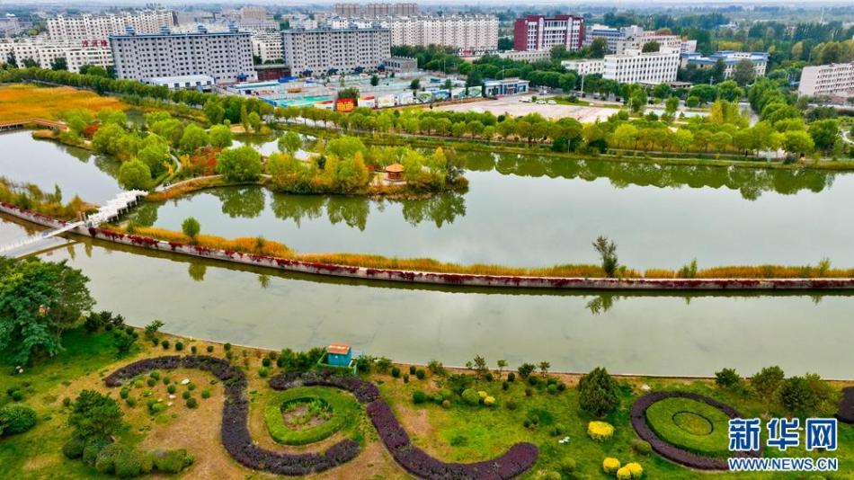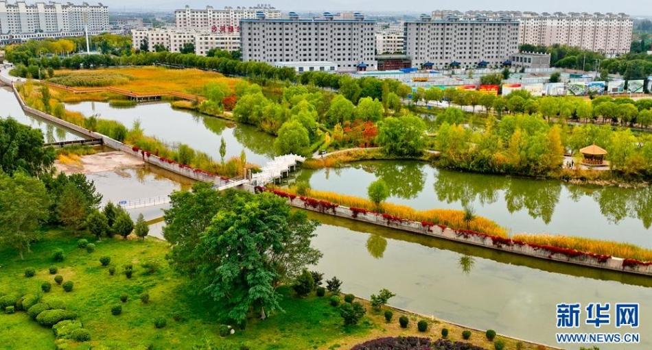 秋日里,位于巴丹吉林沙漠边缘的甘肃省张掖市临泽县,城依河,河傍城,水从城中流过,岸边秋景倒映湖中,呈现出一幅迷人“塞上江南”画卷。新华网发(王将 李刚 摄)