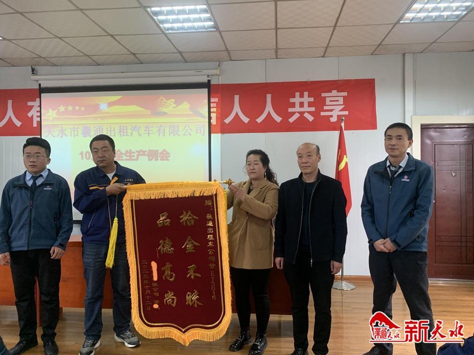 10月12日下午,天水羲通出租车有限责任公司的会议室里,一个有关安全生产的例会正在召开。当分批参加会议的出租车驾驶员正在公司负责人的带领下学习安全生产知识,观看安全教育视频时,有人突然敲开了会议室的门,他们手捧一面写有“拾金不昧品德高尚”的锦旗进入了会议室,后经询问得知,来者是给出租车公司甘ET3016出租车驾驶员赠送锦旗来的。