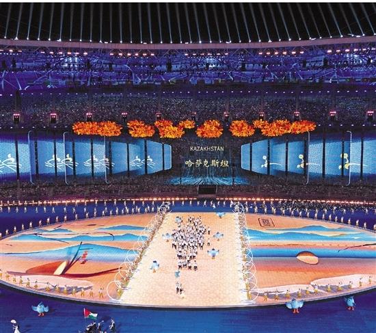 曲院风荷、苏堤春晓、断桥残雪、雷峰夕照……运动员入场时,地屏上交替呈现出不同季节、不同风格的西湖十景。远远望去,各个国家与地区的运动员仿佛行走在杭州西湖美丽的景致之中。