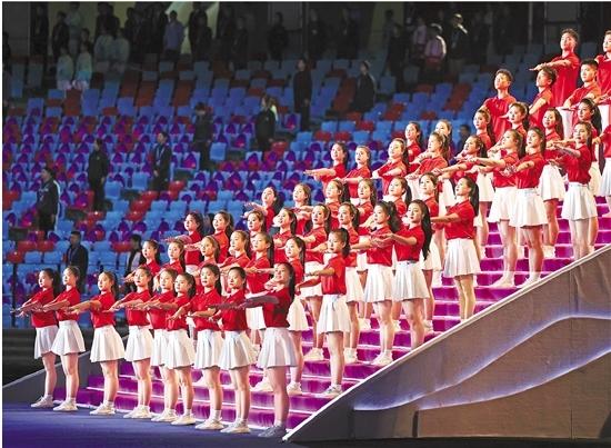 和着歌声,少年儿童簇拥着五星红旗向前;网幕上,旭日洒下和煦而温暖的光,照耀着祖国山河,也照耀在舞台中央这群身着翠绿色衣衫的孩子们身上。这一幅感动全场的美好画面,象征着每一个孩子都是初升的太阳,是蓬勃生长的秧苗,是国家未来的主人翁。