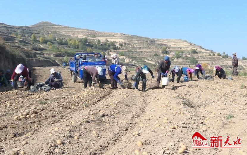 这两天,秦安县王铺镇太平岭流域5000亩马铃薯基地迎来了大丰收,合作社紧抓晴好天气,利用“机械+人工”的方式抓紧采收。在现场,伴随着机器的轰鸣声,一颗颗马铃薯从自动起收机里翻落出来,工人们迅速捡拾,田间地头一派丰收景象。“我们合作社的5000多亩土豆,亩产2千斤左右,大薯一斤能卖8毛多,小薯一斤能卖6毛钱”。秦安县王铺镇胡芳红种养殖专业合作社管理员邵双胜说。