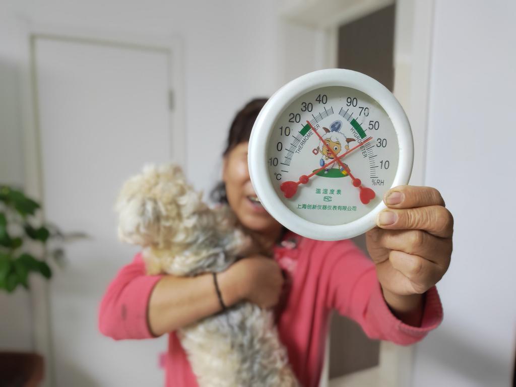 长春市民向记者展示家中温度。新华社记者 李双溪 摄