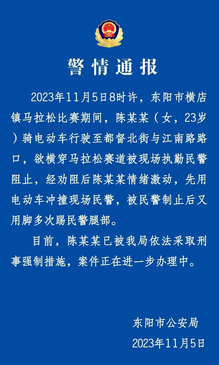 中新网金华11月6日电(董易鑫)浙江金华东阳市公安局11月5日发布警情通报称,2023年11月5日8时许,东阳市横店镇马拉松比赛期间,陈某某(女,23岁)骑电动车行驶至都督北街与江南路路口,欲横穿马拉松赛道被现场执勤民警阻止,经劝阻后陈某某情绪激动,先用电动车冲撞现场民警,被民警制止后又用脚多次踢民警腿部。