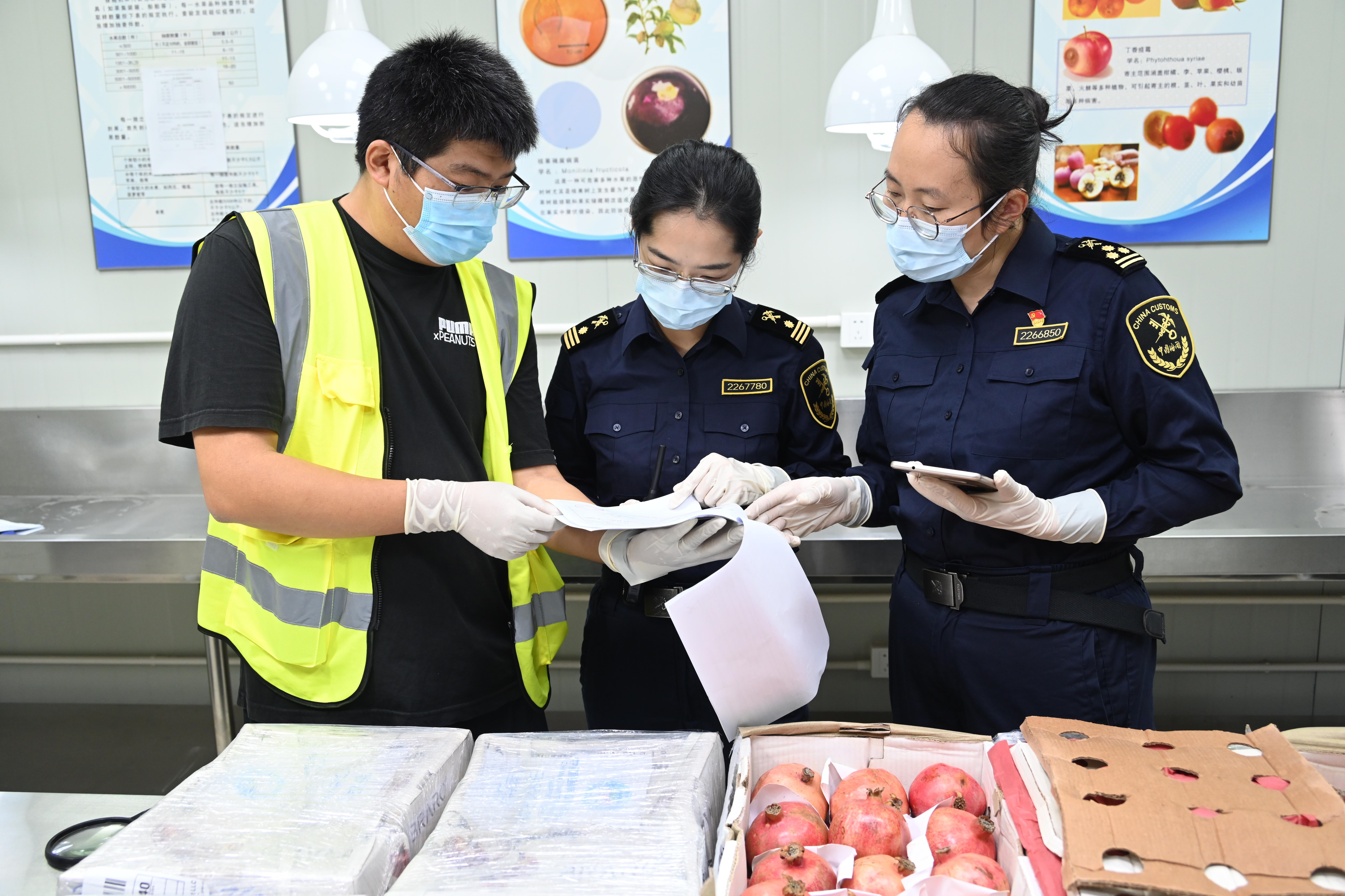△2023年11月2日,上海浦东国际机场,经海关检查无误后,一批200千克来自阿富汗的石榴正常通关,运往第六届进博会现场。