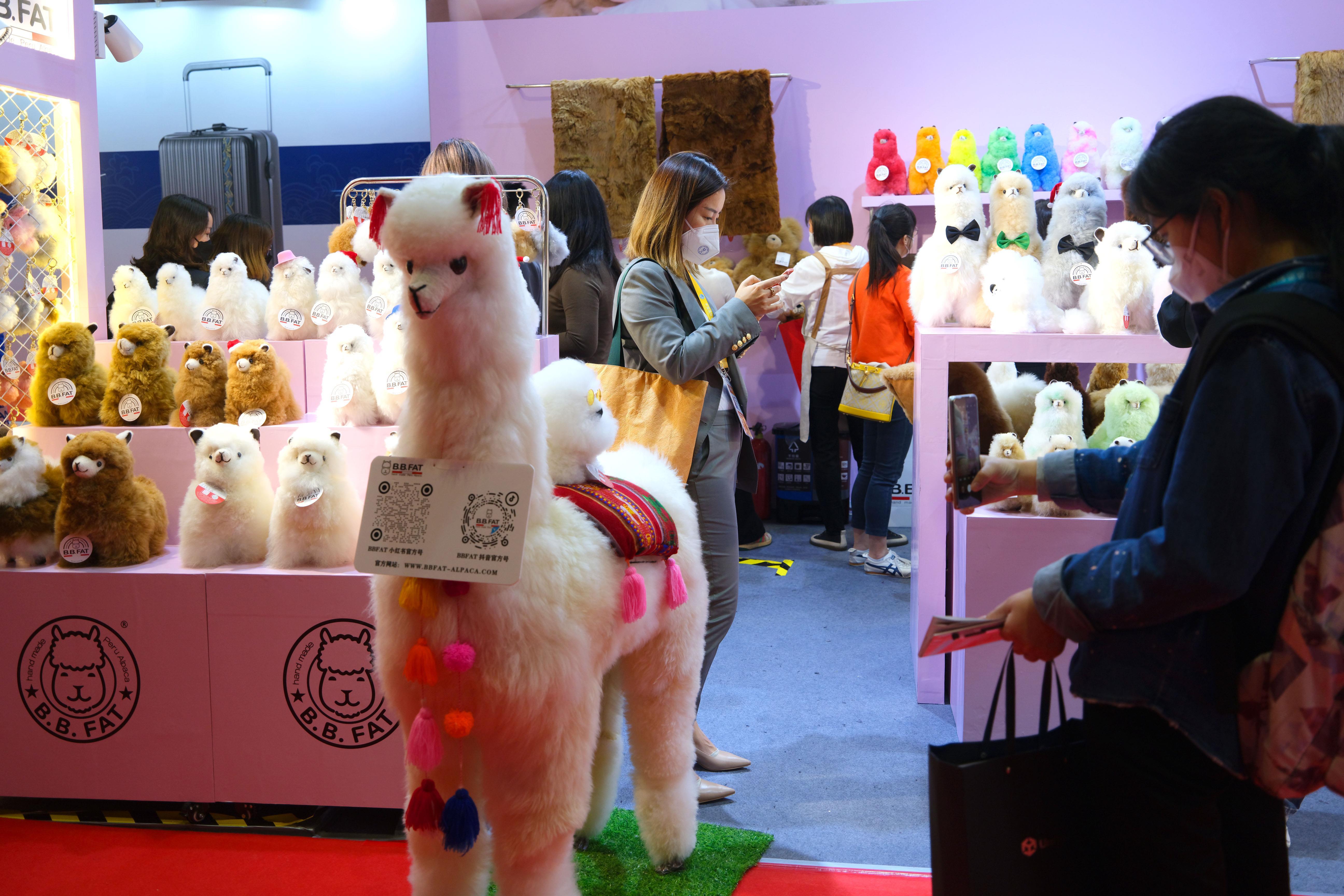 △2022年11月8日,在第五届进博会上,纯手工制作的秘鲁羊驼玩偶深受欢迎。