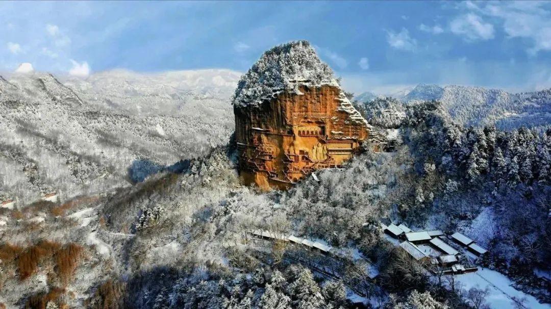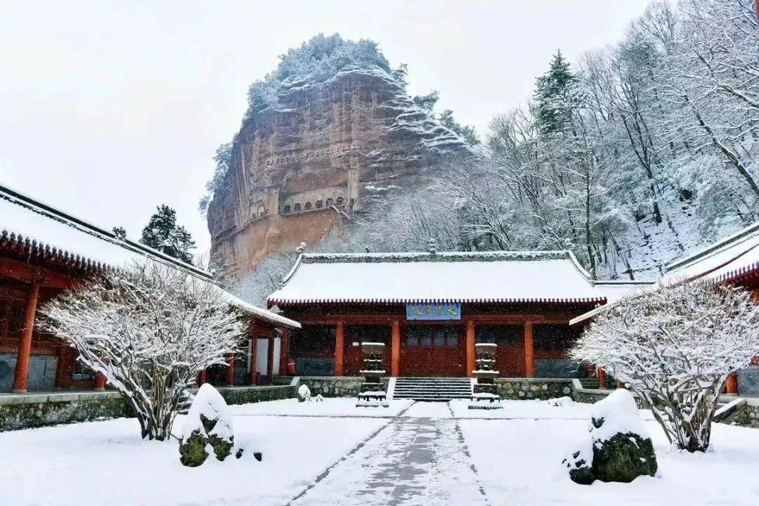 天水麦积山石窟,位于甘肃省天水市麦积区,是麦积山风景名胜区重要景点,是国家5A级旅游景区,是中国四大石窟之一,麦积山石窟被誉为“东方雕塑艺术陈列馆”,现有221座洞窟,上万身精美的泥塑石雕,1300多平方米壁画,层峦叠嶂之间赭红色的麦积山孤峰突起,悬崖峭壁之上,一座座石窟整齐排列,在冬天雪花纷飞中散发着阵阵禅意。