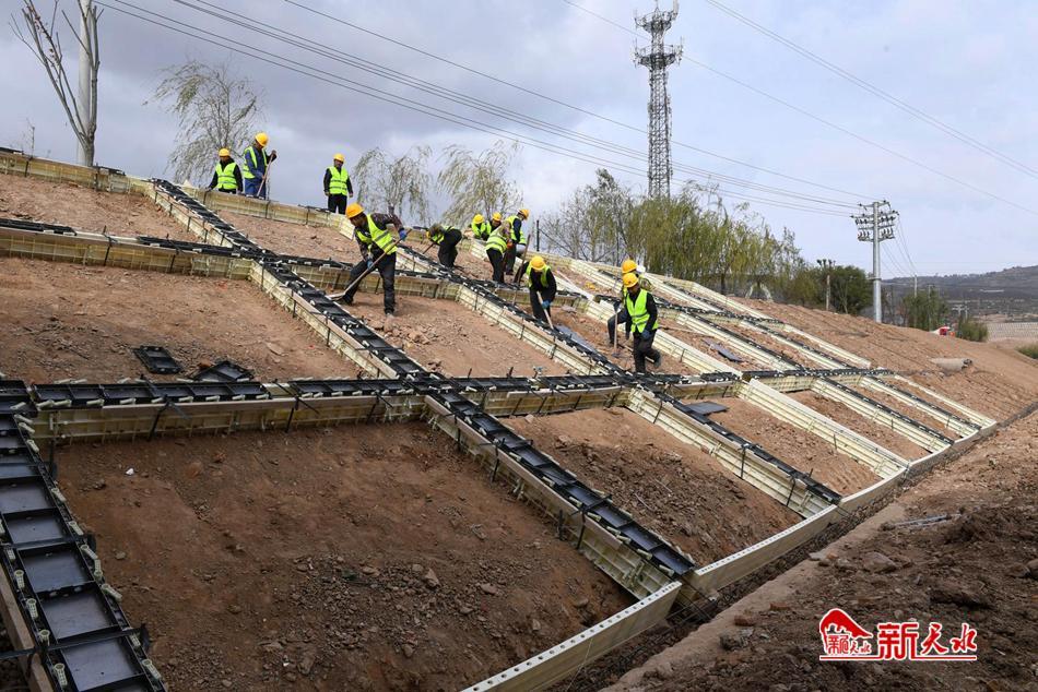 在项目第四标段平峪沟治理段,工人们正在进行河堤格构梁模板支护,之后将进行构梁混凝土浇筑,待明年开春再对河堤坡面进行生态植草,让河堤护坡也成为一道绿景。