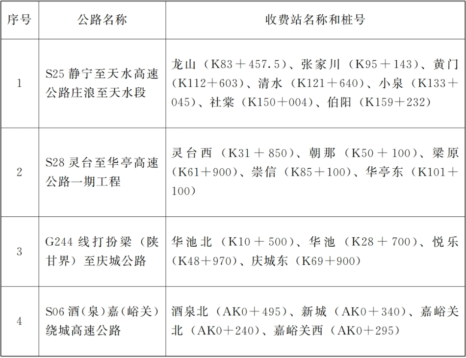 附件:S25静宁至天水高速公路庄浪至天水段等4条公路设置收费站点目录