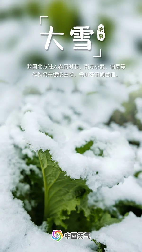 大雪时节,我国北方地区冰天雪地,进入农闲时节。而南方小麦、油菜等作物仍在缓慢生长,需要加强田间管理。一旦遭受冻害,要及时松土增肥、蓄水提温、加强中后期管理,力争把冻害损失降到最低。