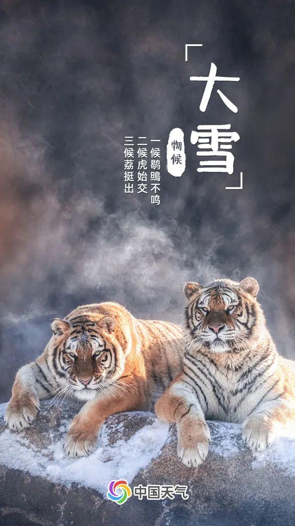 大雪分为三候:一候鹖鴠不鸣,因天气寒冷,寒号鸟都不再鸣叫了;二候虎始交,由于此时是阴气最盛的时期,且阳气已有所萌动,老虎开始有求偶行为;三候荔挺出,“荔挺”是兰草的一种,它们会在感到阳气时抽出新芽。