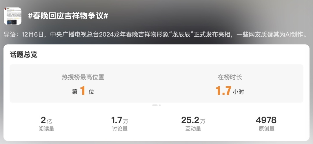 今天上午,#春晚回应吉祥物争议#登上热搜榜首,目前已引发超2亿阅读量。