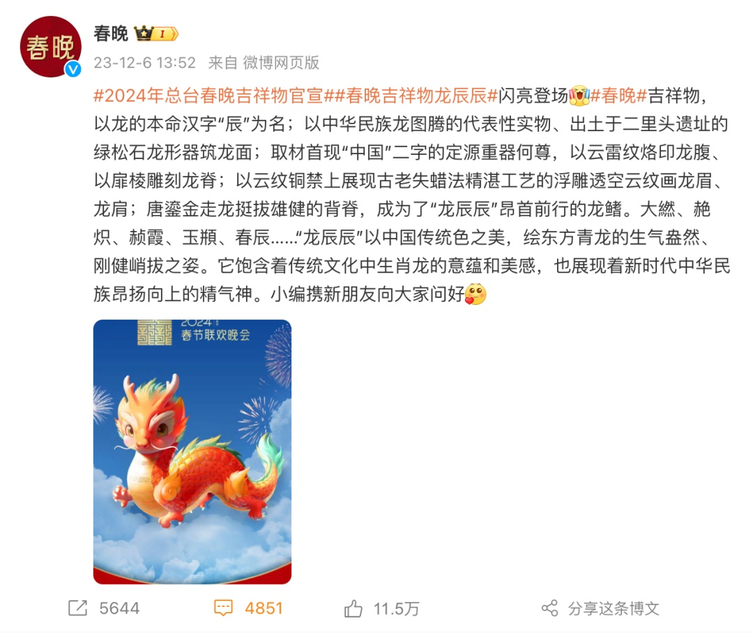 12月6日,2024年春晚吉祥物“龙辰辰”形象公开。