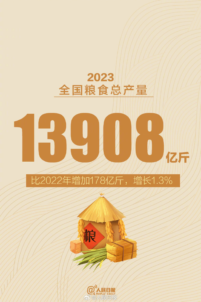 国家统计局农村司司长王贵荣解读粮食生产情况表示:2023年,党中央、国务院高度重视粮食生产,各地区各部门严格落实耕地保护和粮食安全责任,持续加大对粮食生产的支持力度,有力克服黄淮罕见“烂场雨”、华北东北局地严重洪涝、西北局部干旱等不利因素影响,全年粮食产量再创历史新高。2023年全国粮食总产量13908.2亿斤,比上年增加177.6亿斤,增长1.3%,连续9年稳定在1.3万亿斤以上。