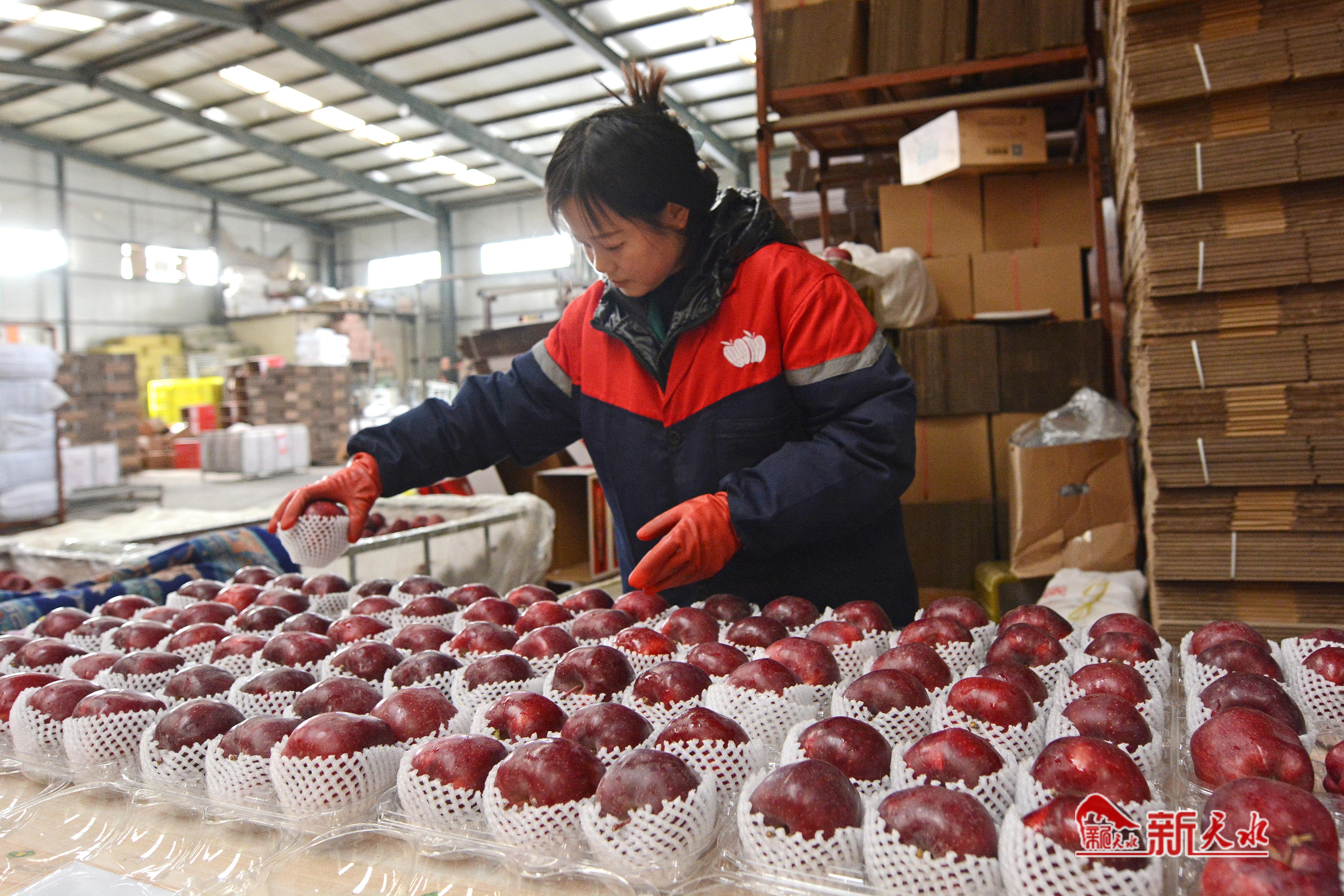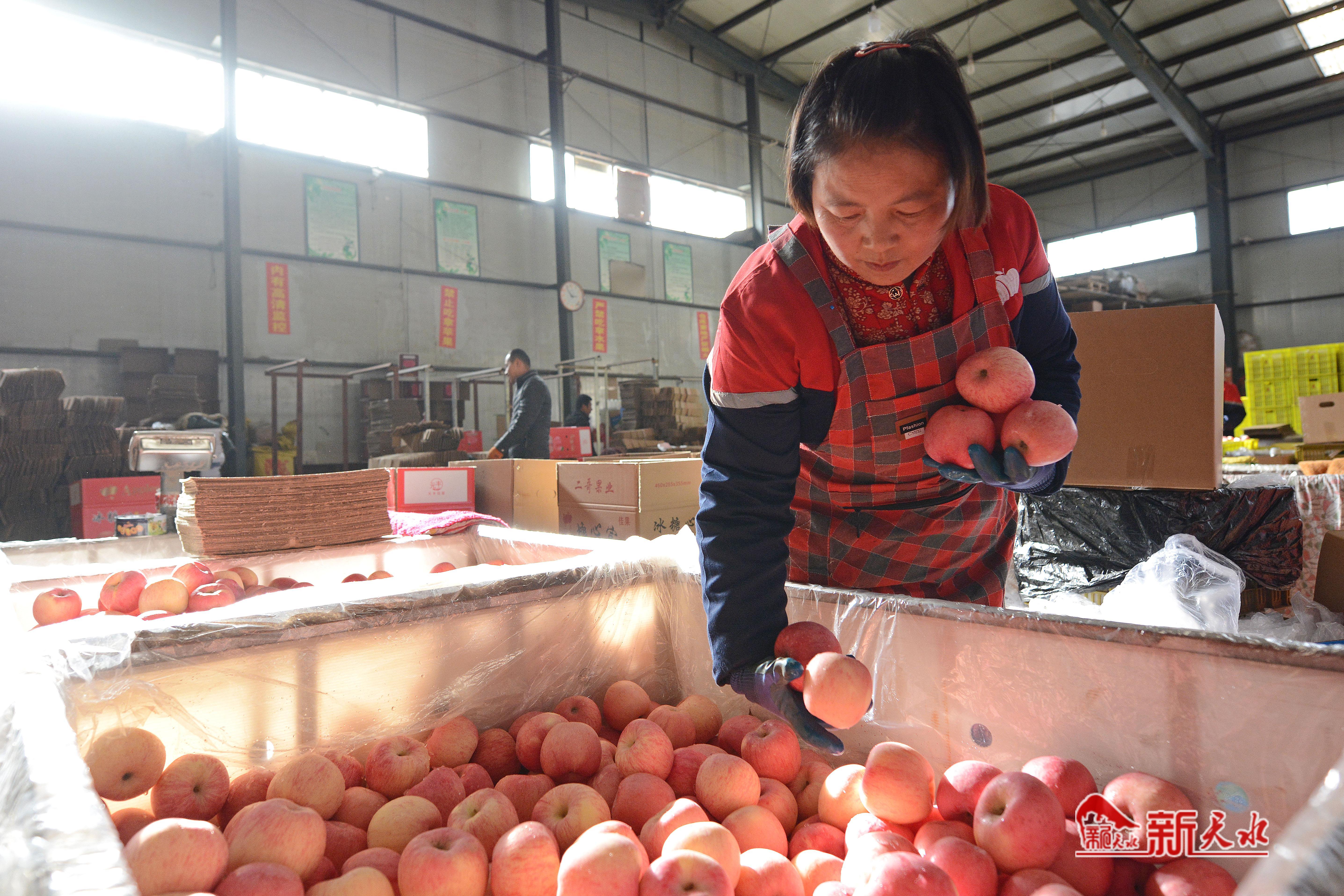 秦安县二哥果业农民专业合作社内,工作人员正在分拣包装苹果。