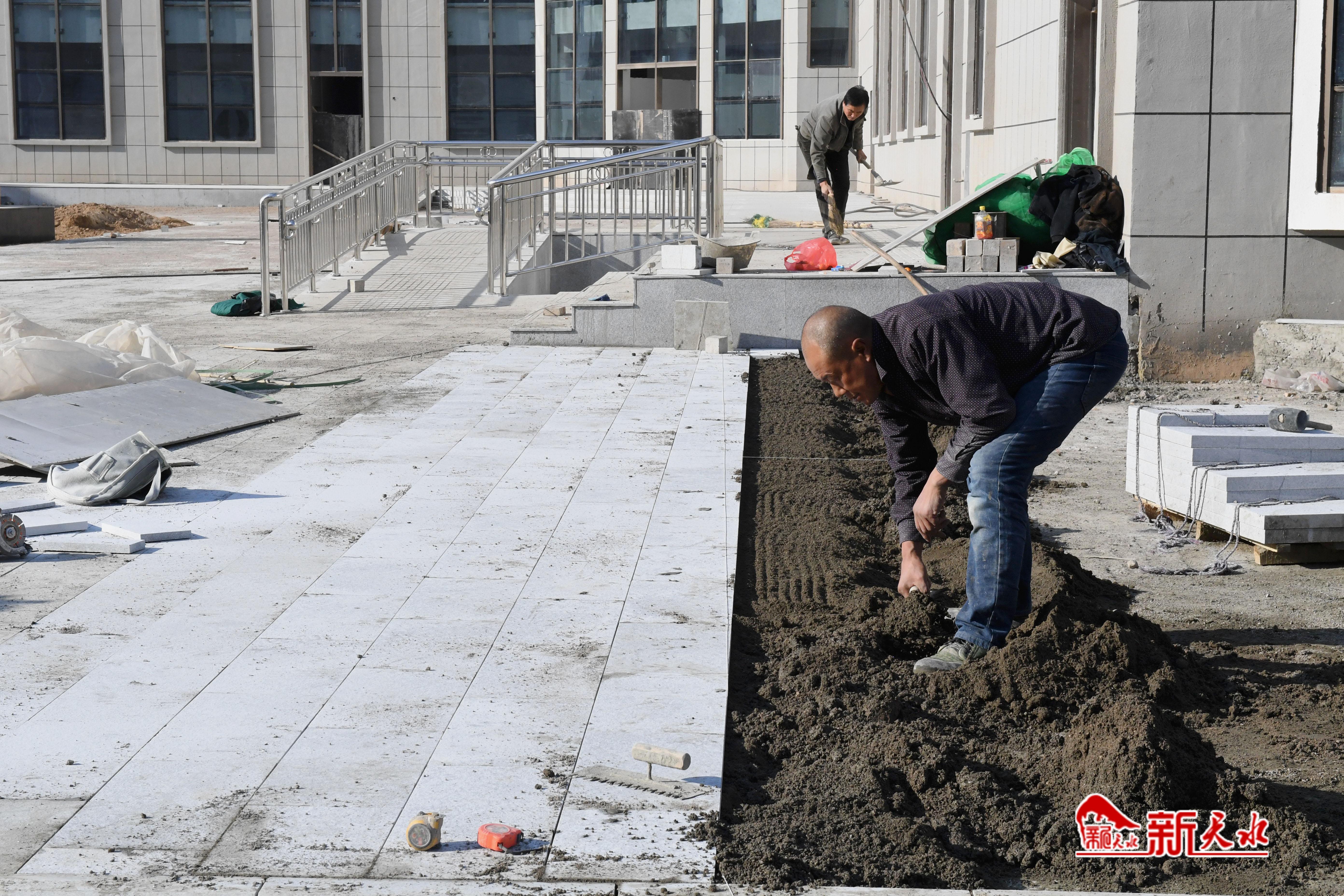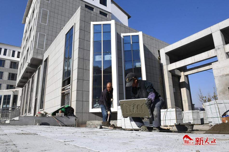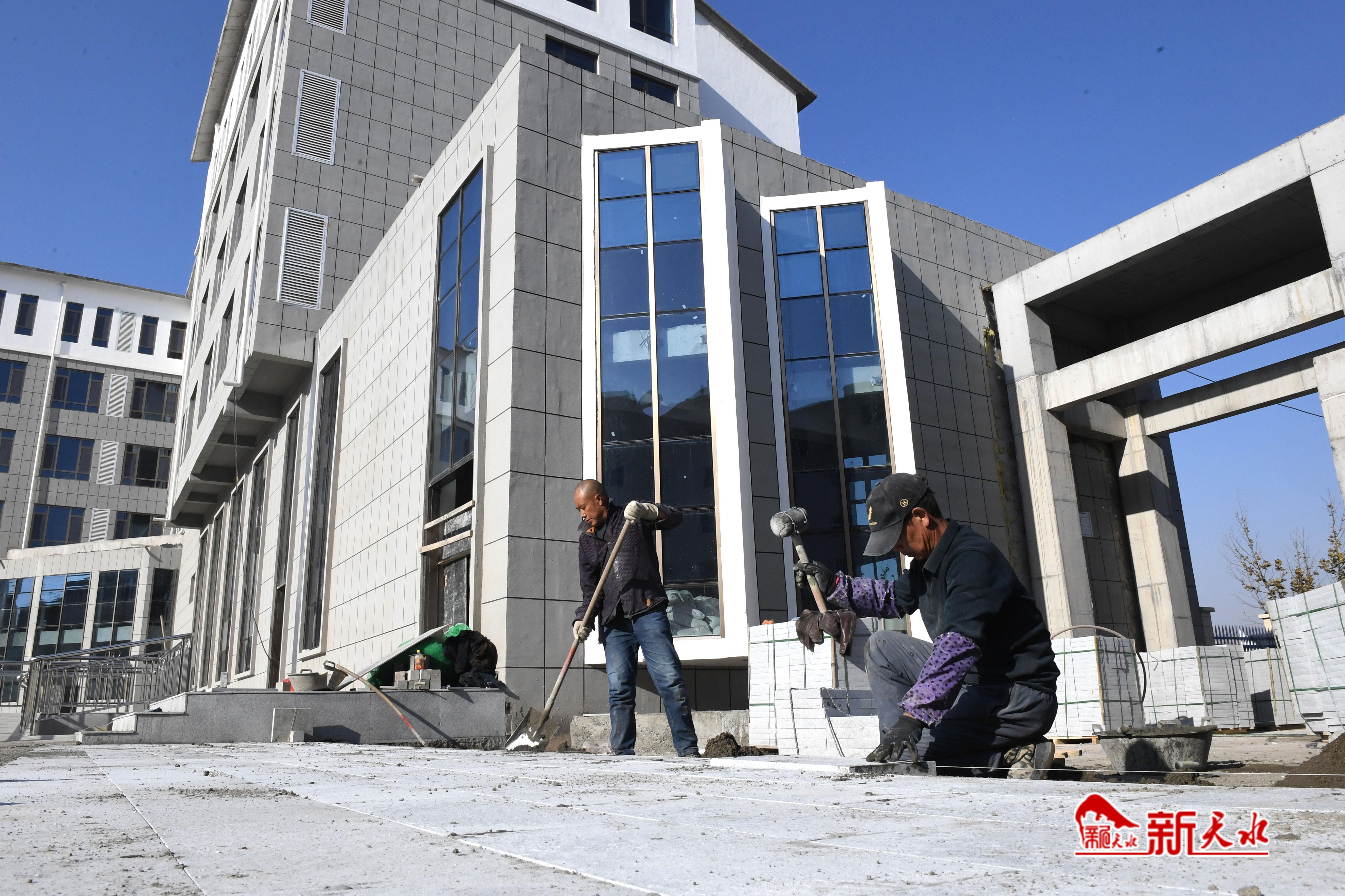 12月11日,武山县中医医院医养综合楼项目建设现场,工人们正在进行室外附属工程的建设。