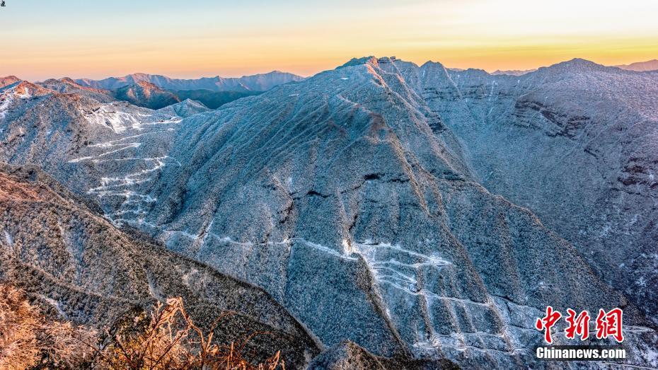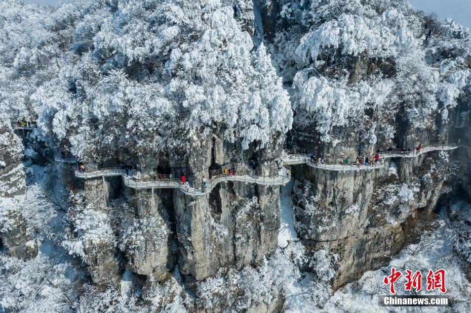 近日,陕西汉中迎来降雪天气,龙头山景区银装素裹,连绵的山峦被积雪点缀,吸引不少游客前来赏雪。图为航拍龙头山景区栈道。汉中龙头山景区 供图