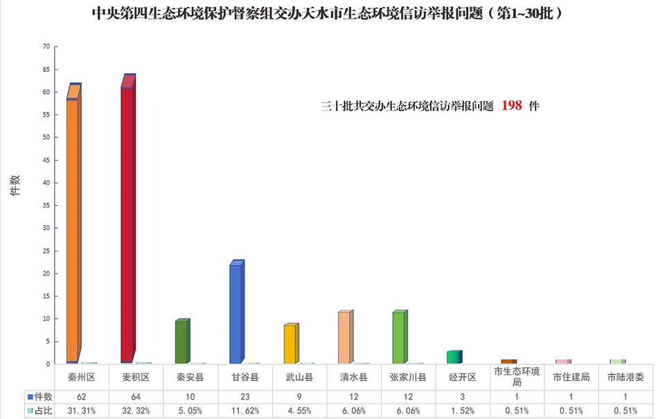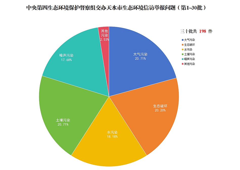 12月23日,中央第四生态环境保护督察组向我市交办了第三十批群众举报件,共5件(其中来电4件,来信1件),其中秦州区2件、麦积区1件、甘谷县1件、张家川县1件。群众举报反映问题涉及大气污染2件、生态破坏1件、噪声污染2件。