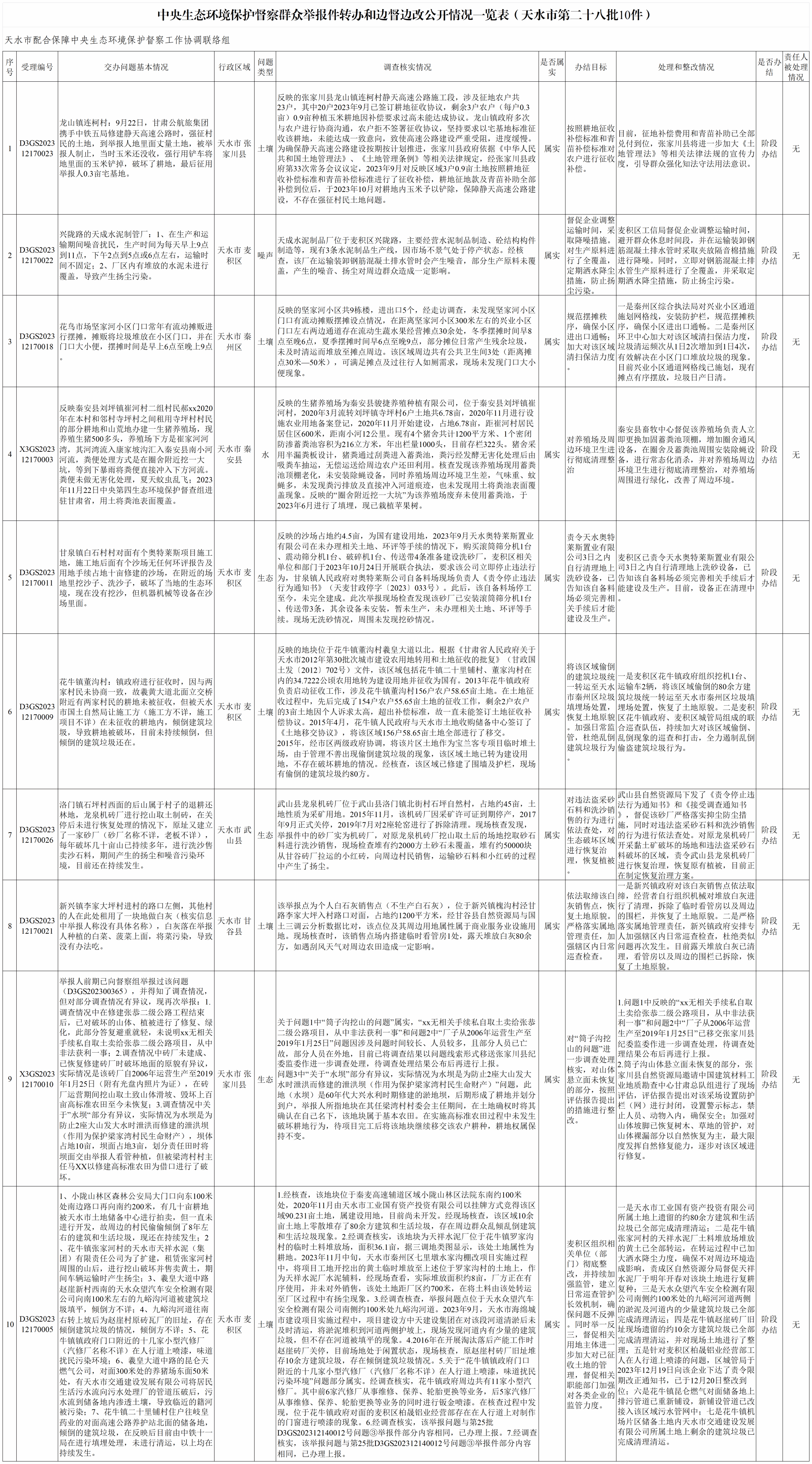 2023年12月18日,我市接到中央第四生态环境保护督察组交办的第二十八批群众举报件10件(一般件8件,重点件2件),其中秦州区1件、麦积区4件、秦安县1件、甘谷县1件、武山县1件、张家川县2件;群众举报反映问题涉及水污染1件、土壤污染5件、生态破坏3件、噪声污染1件。现将具体办理情况公示如下。