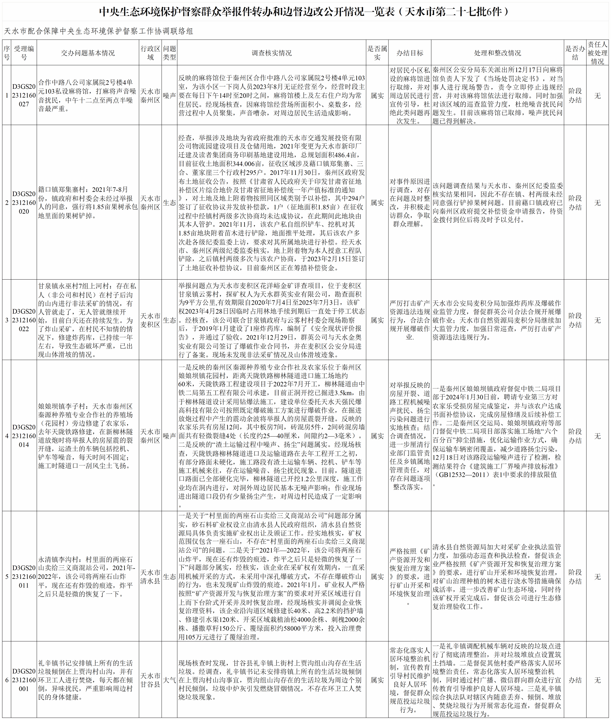 中央第四生态环境保护督察组交办天水市第二十七、二十八批群众举报件边督边改情况