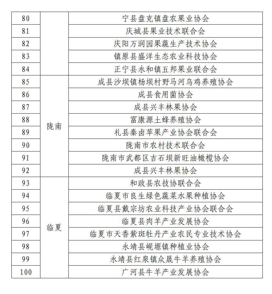 各市(州)农技协联合会,各科普小院、科技小院,各相关单位:为深入贯彻党的二十大精神,落实中国农技协、省科协关于农技协工作安排部署,推动农技协组织振兴,提升农技协社会化组织动员能力,充分发挥农技协组织在促进农业产业发展、提高农民组织化程度和科学素质等方面的积极作用,省农技协联合会开展了 2023 年“甘肃省百强农技协”推荐选树工作。经过各级科协的逐级推荐、组织评审,选树榆中县农村专业技术联合会等100家农技协为甘肃省农技协 2023 年“百强农技协”。