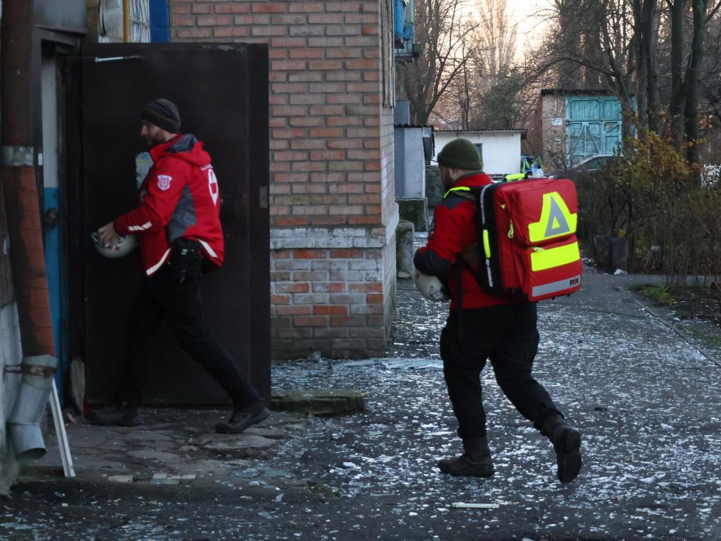 11月25日,乌克兰红十字会救援人员在基辅市一栋遭空袭的居民楼实施清理和救助工作。新华社发(罗曼·佩图什科夫摄)