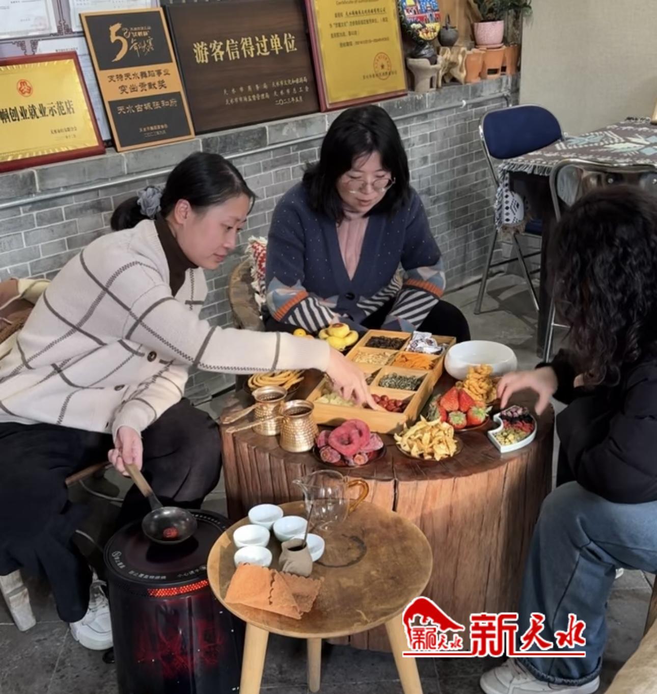“我们为了迎接元旦小长假,给店里做了一些装饰,有小灯笼、小辣椒、红梅花等等,营造节日的氛围。店里还做了一些推广活动,会面向消费者发放一些代金券,比如套餐消费,消费100元减10元,消费满200元减20元,满300元以上可以优惠30至50元,店里还提供了一些天水当地的土特产,吸引更多的客人来到我们店里喝茶和打卡。”天水罐罐茶非遗传承人马慧说。