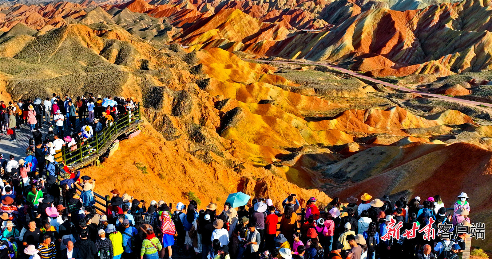 9月30日,众多游客在张掖七彩丹霞景区欣赏独特的丹霞地貌,领略西北壮美景色。新甘肃·甘肃日报通讯员王将