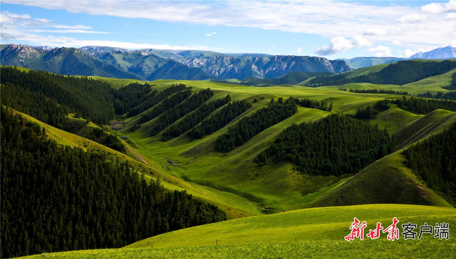 甘肃肃南裕固族自治县大河乡境内的祁连山群山环抱,蓝天白云与林海互相映衬,风光秀丽。新甘肃·甘肃日报通讯员王将