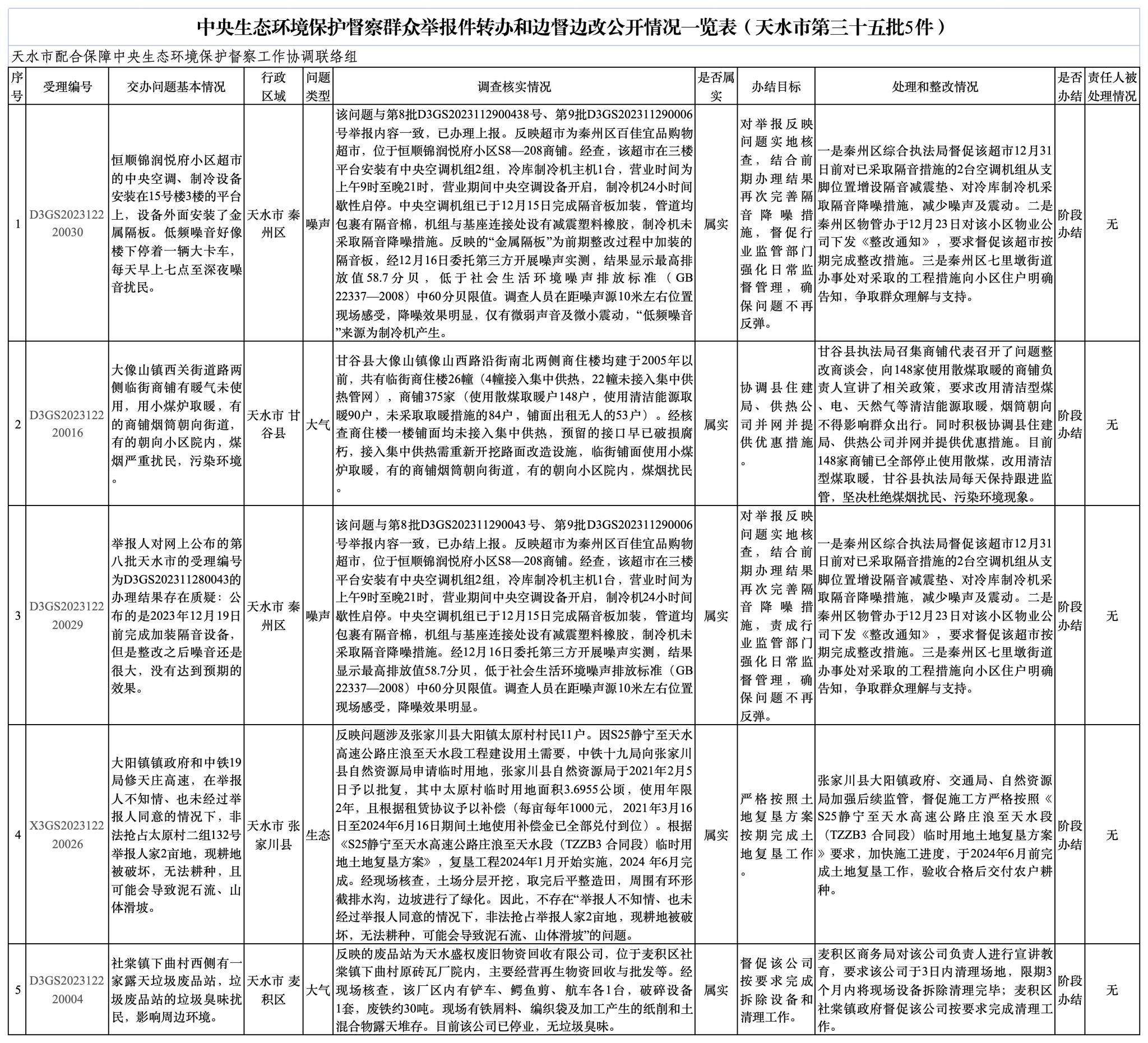 2023年12月23日,我市接到中央第四生态环境保护督察组交办的第三十五批群众举报件5件(均为一般件),其中秦州区2件、麦积区1件、甘谷县1件、张家川县1件;群众举报反映问题涉及大气污染2件、生态破坏1件、噪声污染2件。现将具体办理情况公示如下。