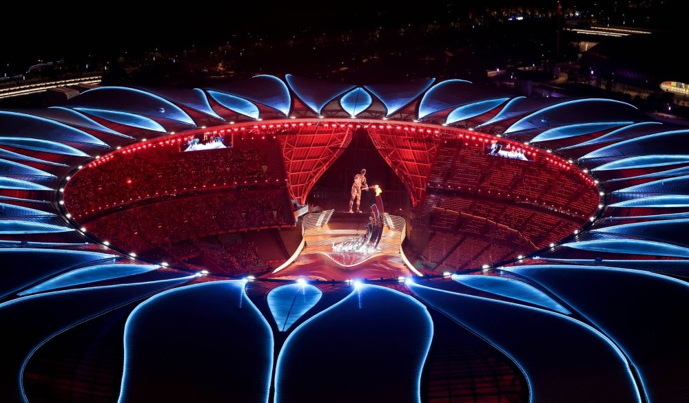 2023年9月23日,最后一棒火炬手汪顺和数字火炬手在杭州亚运会开幕式上点燃主火炬。新华社记者 程婷婷 摄