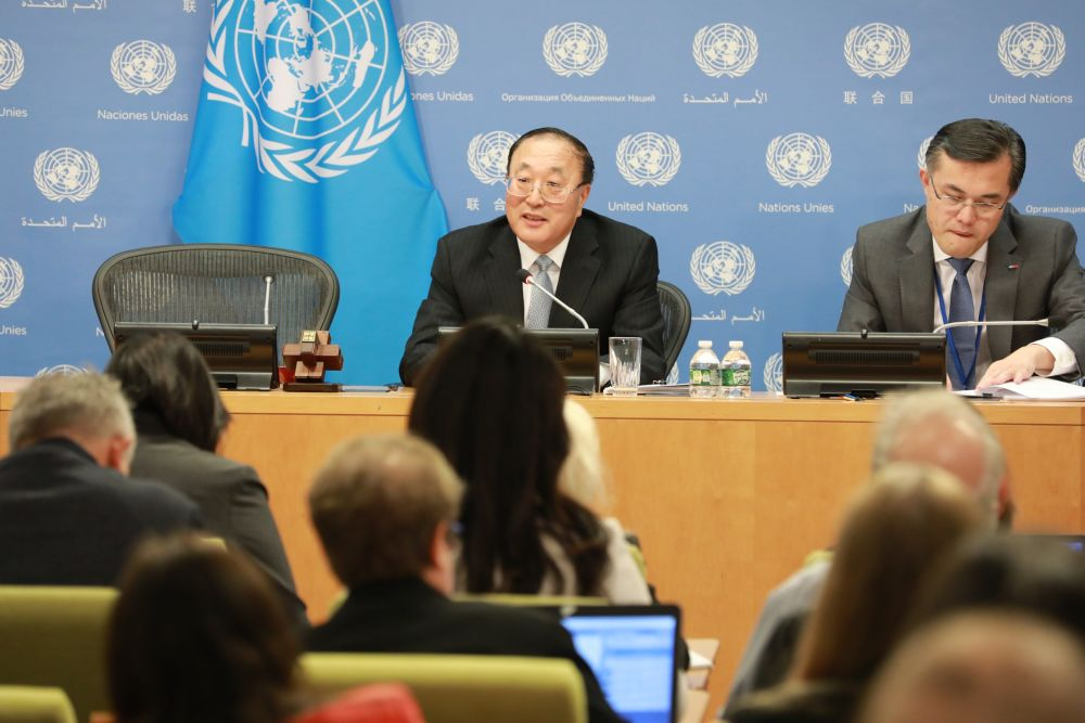 2023年11月1日,在位于纽约的联合国总部,中国常驻联合国代表张军(左)在媒体吹风会上讲话。新华社记者 谢锷 摄