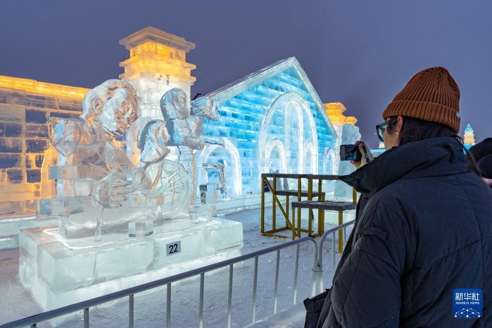 1月4日,在哈尔滨冰雪大世界园区内,游客观赏冰雕作品。