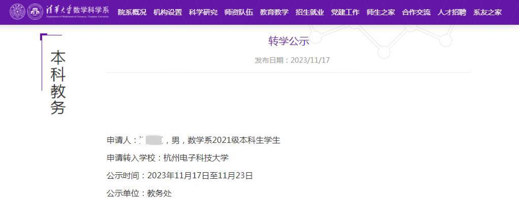清华大学数学科学系官网关于数学系2021级本科生温某某转学的公示。