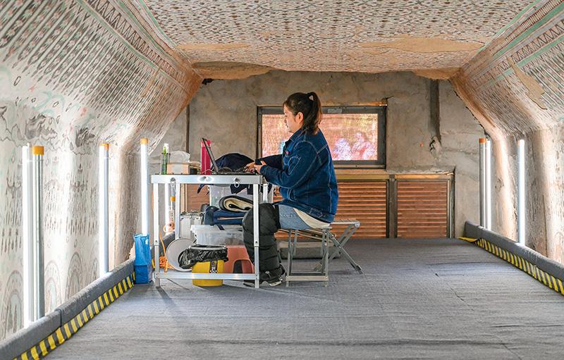 在敦煌莫高窟正在保护修缮的第55窟内,文保工作者对采集的数据进行整理(2023年8月3日摄) 李贺摄/本刊