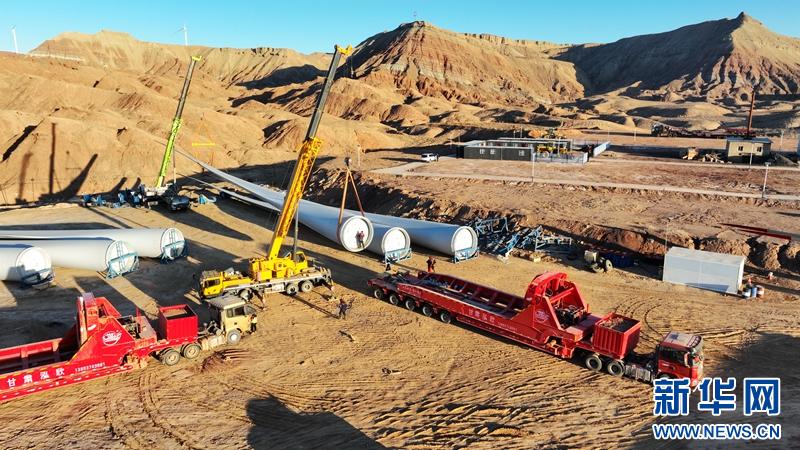 隆冬季节,在甘肃省张掖市甘州区平山湖风电基地国家电投10万千瓦风电项目建设工地,工人正在进行风机叶片吊装作业。