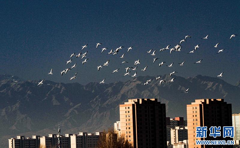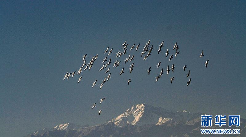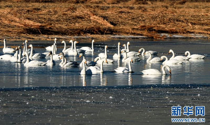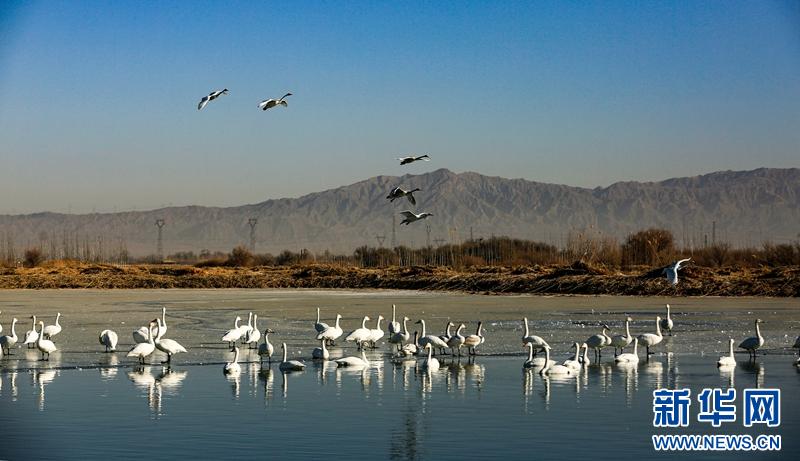 1月11日,一群大白天鹅飞来甘肃张掖国家湿地公园栖息。清澈的湖水、金黄的芦苇、飞腾的候鸟、巍峨的山峰,构成了一幅山水生态画卷。新华网发(陈礼摄)