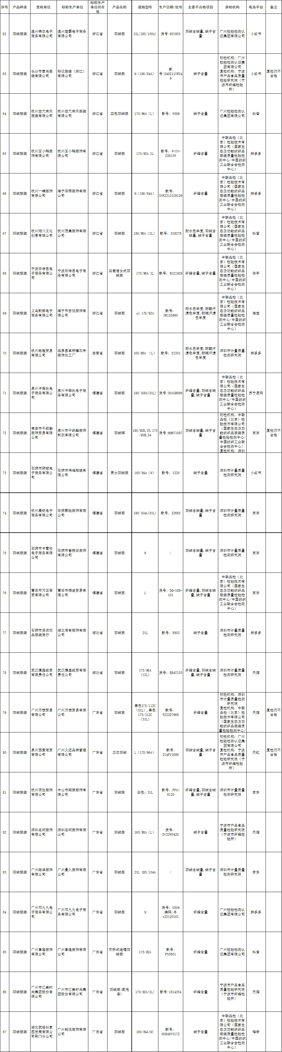 11批次产品羽绒含绒量不合格