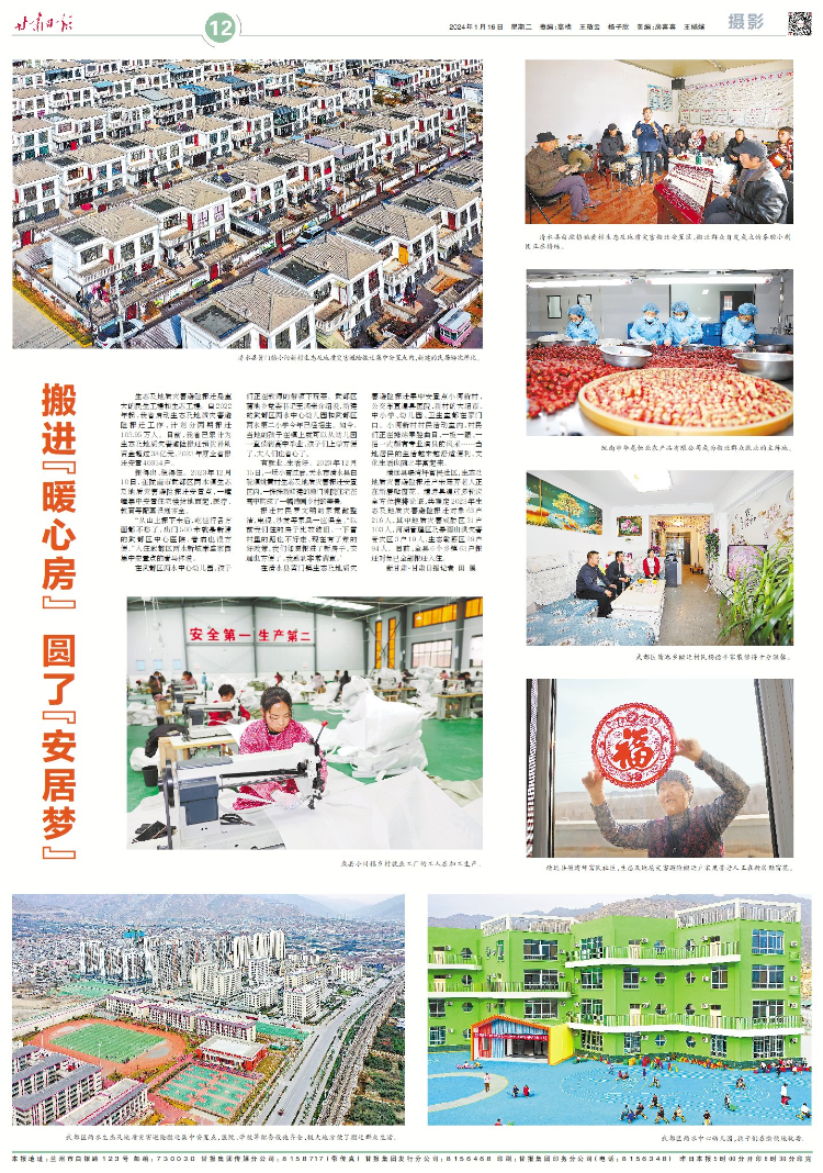 靖远县碾湾坪富民社区,生态及地质灾害避险搬迁户宋庭芳老人正在新居贴窗花。靖远县通过多轮次全方位摸排论证,共确定2023年生态及地质灾害避险搬迁对象63户216人,其中地质灾害威胁区31户103人,河湖管理区及暴雨山洪灾害受灾区3户19人,生态敏感区29户94人。目前,全县6个乡镇63户搬迁对象已全部搬迁入住。