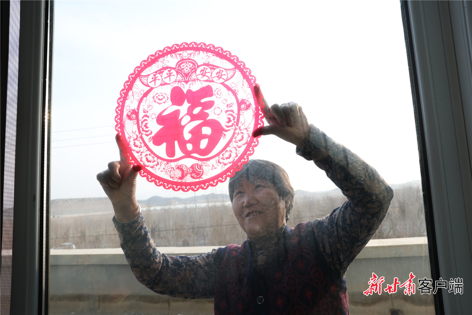 靖远县碾湾坪富民社区,生态及地质灾害避险搬迁户宋庭芳老人正在新居贴窗花。