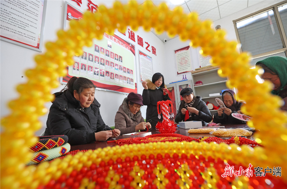清水县黄门镇小河新村搬迁群众在小区活动室学习珠编工艺品制作。