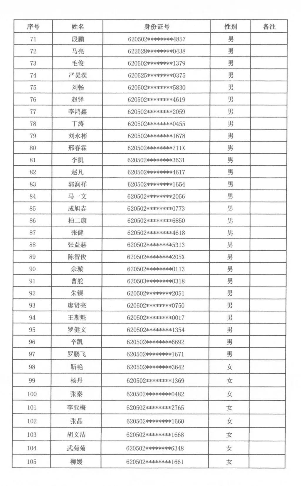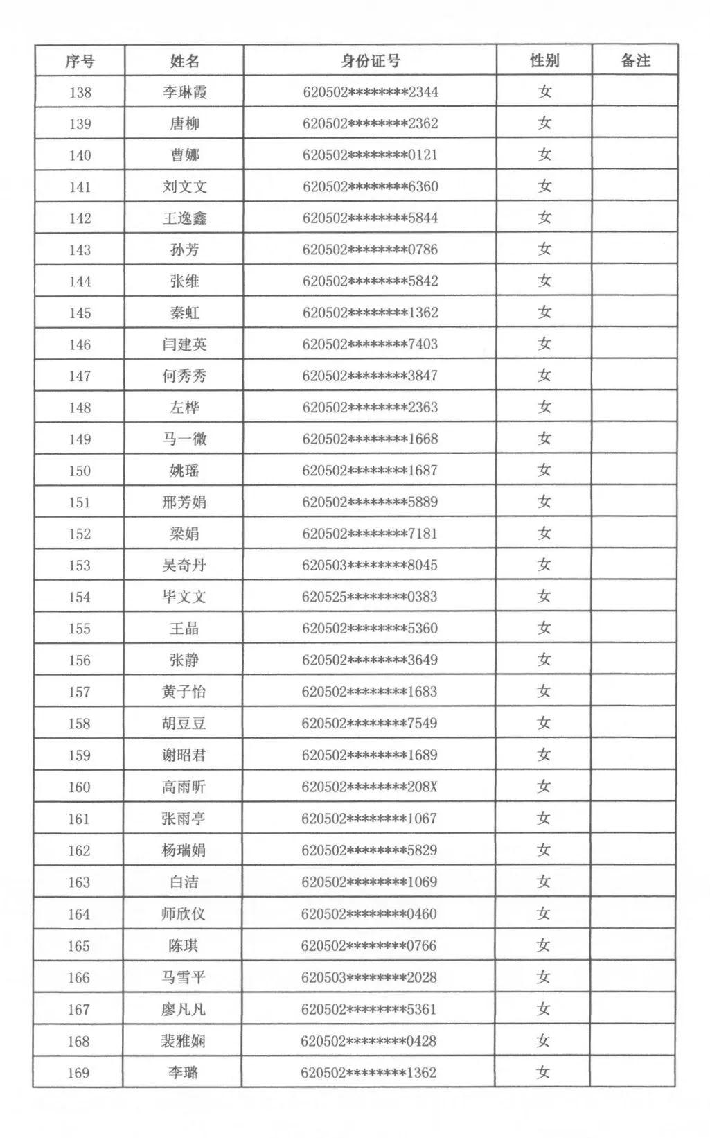 根据天水市秦州区人力资源和社会保障局、天水市公安局秦州分局关于2023年公开招聘警务辅助人员工作安排,通过笔试、面试、体检、政审,拟聘用警务辅助人员男性97名、女性72名,现将拟聘用人员名单公示如下,广泛接受社会各界的监督。公示期满后,将按程序办理聘用派遣手续。