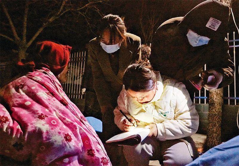 2023年12月19日,在甘肃省积石山县中西医结合医院门口,当地干部在登记受灾群众信息。18日23时59分,甘肃省临夏回族自治州积石山保安族东乡族撒拉族自治县发生6.2级地震。新华社记者 马希平/摄